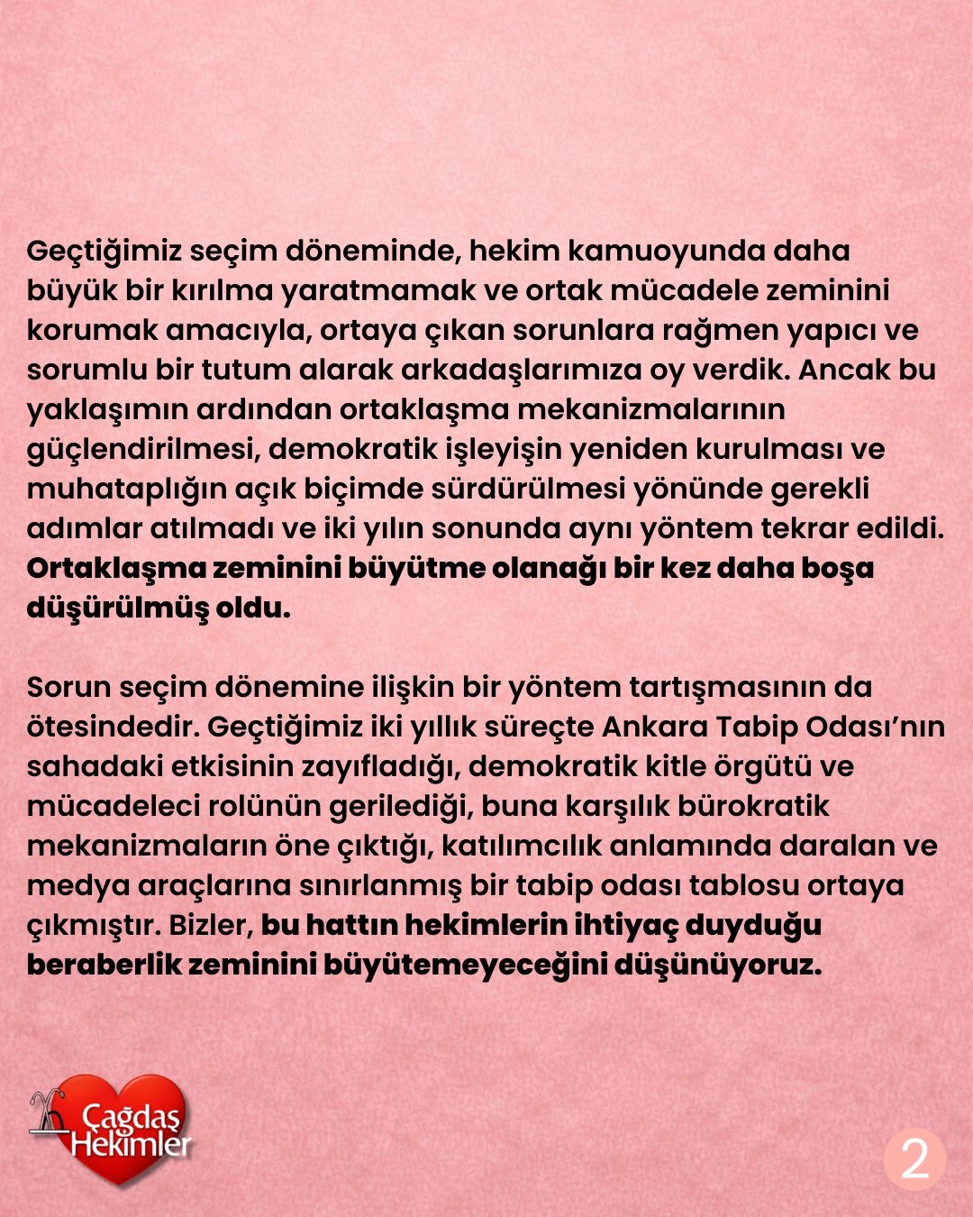 Özellikle vurgulamak isteriz ki, oluşum biçimine ve izlediği siyasal hatta eleştiri yönelttiğimiz listede, uzun yıllardır birlikte çalıştığımız ve bundan sonra da birlikte çalışmak istediğimiz, Çağdaş Hekimler'e emek vermiş çok değerli arkadaşlarımız da bulunmaktadır. Mevcut tablonun detaylarından onların da bütünüyle hoşnut ve hatta yer yer haberdar olmadığını biliyoruz. Bu nedenle arkadaşlarımıza, tüm hekim kamuoyu önünde açık çağrımız; tabip odasının olası kaybını dahi gölgede bırakacak kadar ağır sonuçlar doğurabilecek, hekim hareketinde derin yaralar açacak bu tutumların parçası olmamalarıdır.