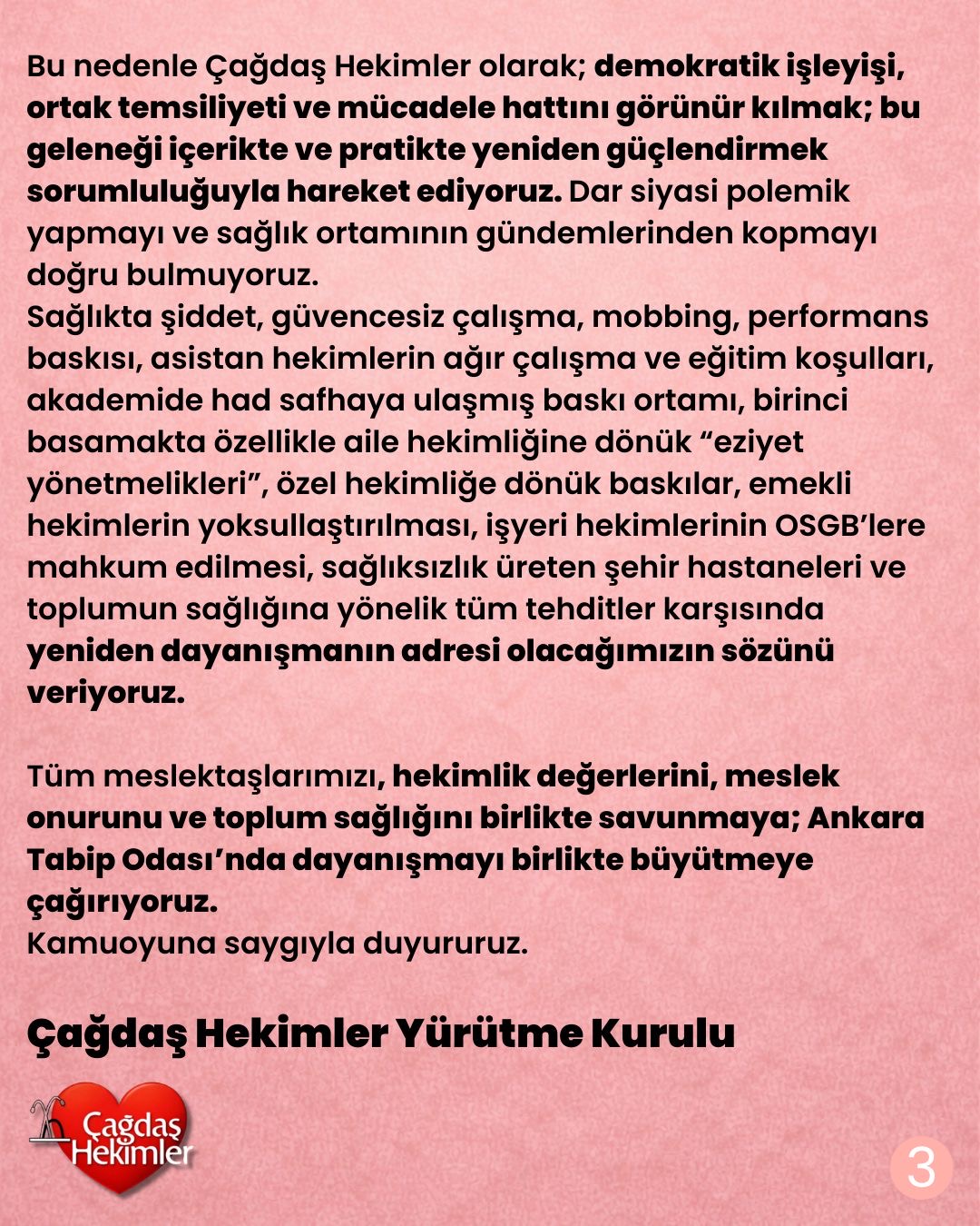 Biz, Çağdaş Hekimler olarak, bu gidişata itiraz ediyoruz. Sağlığın kamusal-toplumsal bir hak olduğunu savunuyoruz. Şehir hastaneleri ve AVM tipi sağlık anlayışına karşıyız. Sağlık emekçilerine yönelik şiddetin ve mobbingin karşısındayız. Güvenceli çalışma, insanca ücret, nitelikli eğitim ve emeklilikte onurlu yaşam hakkı istiyoruz. Doğanın, kentin ve toplumun sağlığını birlikte savunuyoruz.